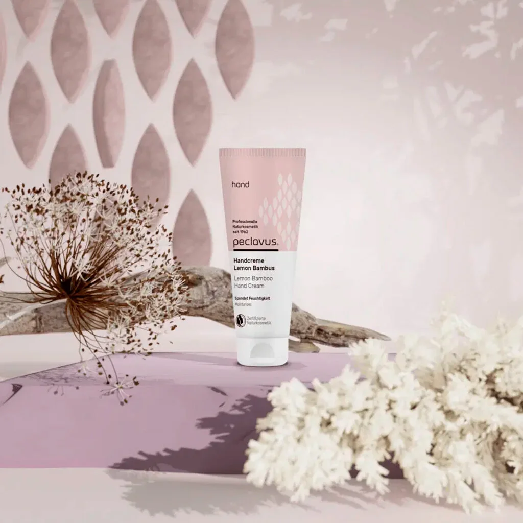 Die peclavus hand Handcreme Lemon Bambus zieht sehr schnell ein und spendet beanspruchten Händen wertvolle Feuchtigkeit. Der reich enthaltene Bambussprossen-Extrakt entfaltet dabei seine volle Wirkung. Fruchtige Lemon-Essenzen verbinden sich mit der Frische des asiatischen Bambus und bringen gemeinsam neuen Schwung in Körper und Geist. Die raffinierte Kombination aus Mandelöl und Bio-Sheabutter beruhigt, glättet und spendet wertvolle Feuchtigkeit. Die Hände fühlen sich samtweich und gepflegt an. NATRUE-zertifizierte Naturkosmetik | vegan