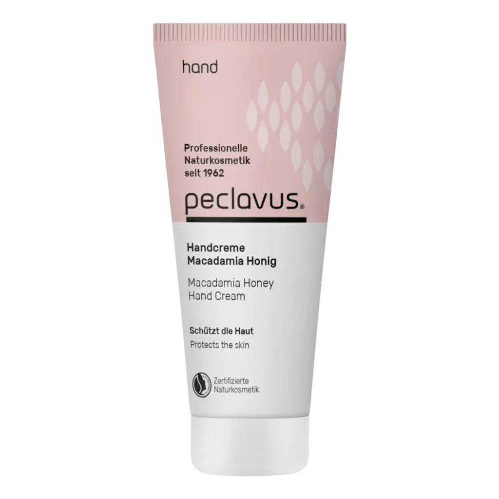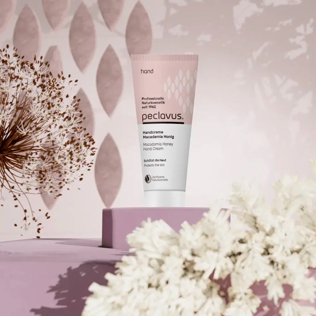 Die peclavus hand Handcreme Macadamia Honig zieht sehr schnell ein und schützt beanspruchte Hände vor dem Austrocknen. Das reich enthaltene Macadamianussöl stärkt die natürliche Schutzbarriere der Haut und fördert die Regeneration. Zugleich lösen die Königin der Nüsse und der süß vertraute Duft des Honigs tief empfundene Gefühle innerer Ruhe und sanfter Geborgenheit aus. Die raffinierte Kombination aus Mandelöl und Bio-Sheabutter beruhigt, glättet und spendet wertvolle Feuchtigkeit. Die Hände fühlen sich samtweich und gepflegt an. NATRUE-zertifizierte Naturkosmetik | vegan