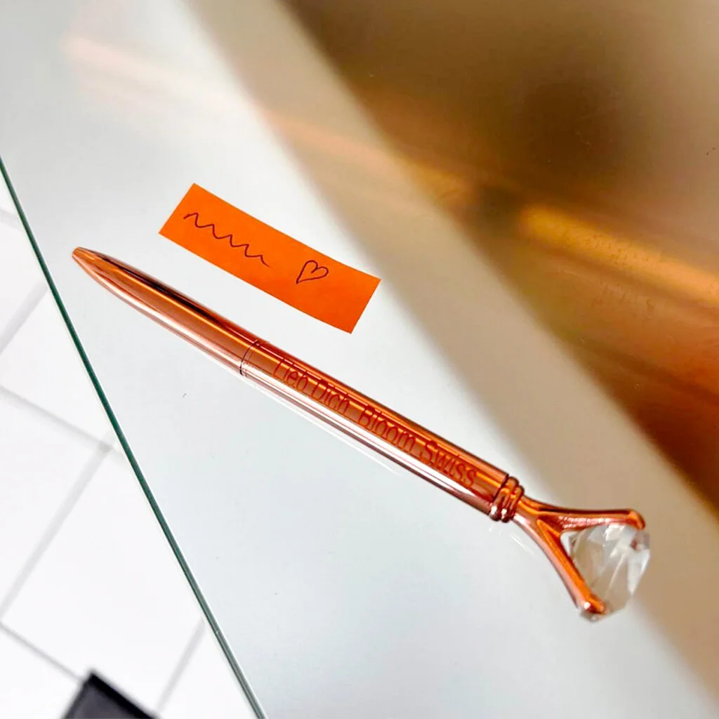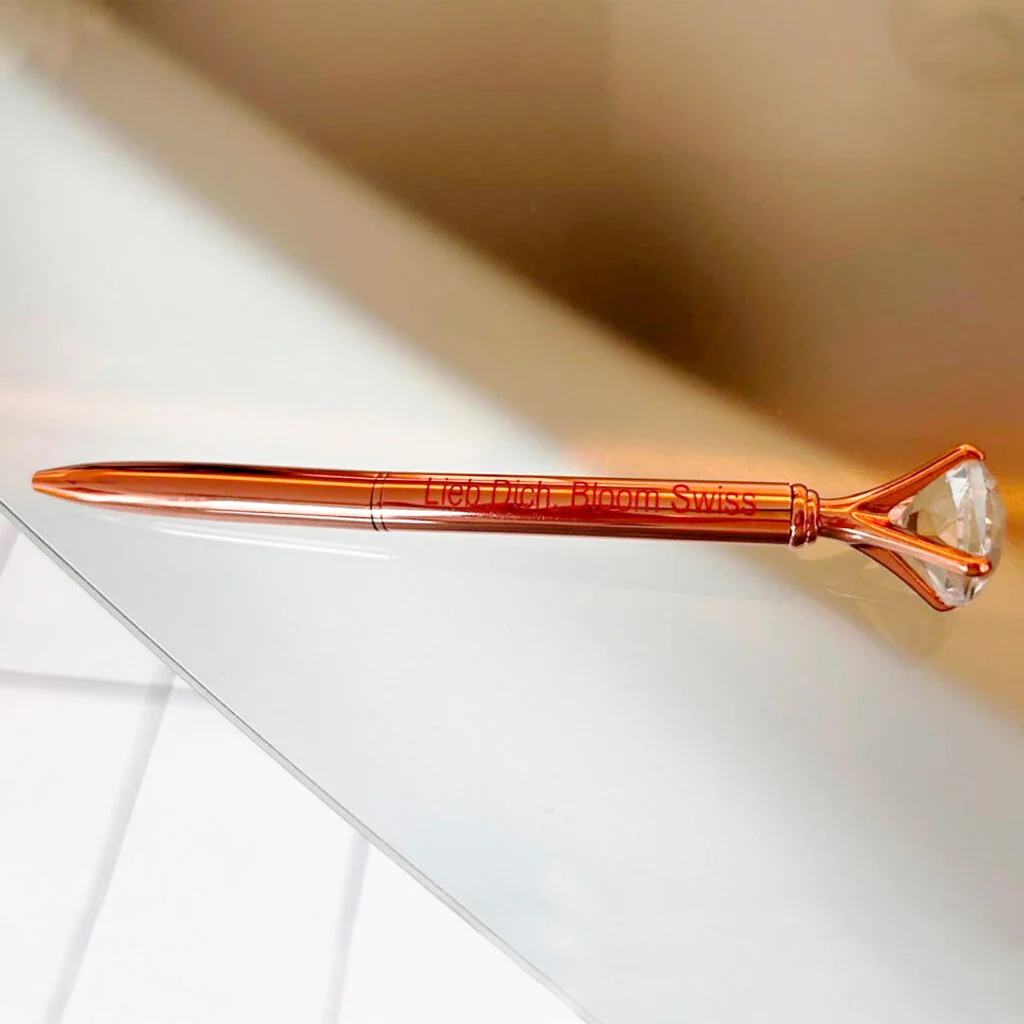Eleganter Kugelschreiber in Roségold mit funkelndem Kristall an der Spitze. Ein stilvolles Accessoire für Notizen, Unterschriften oder als Geschenkidee. Mit der Gravur „Lieb Dich. Bloom Swiss“ – ein besonderes Detail, das ihn einzigartig macht.
