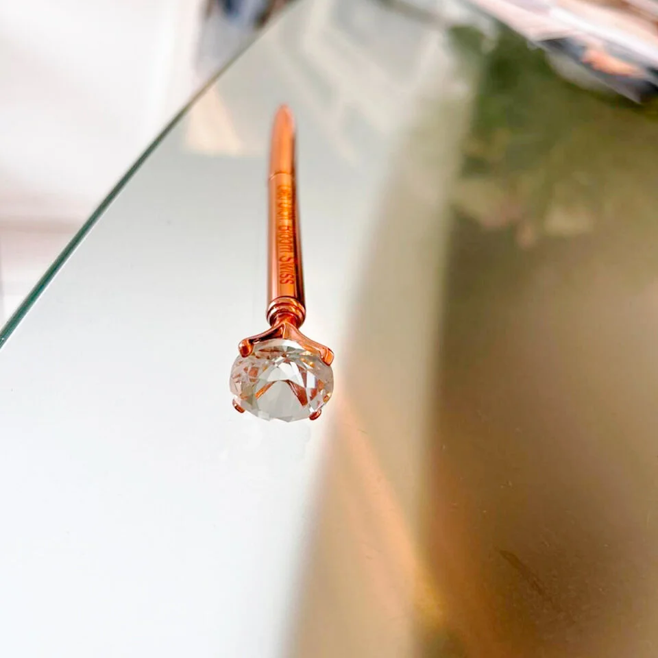 Eleganter Kugelschreiber in Roségold mit funkelndem Kristall an der Spitze.